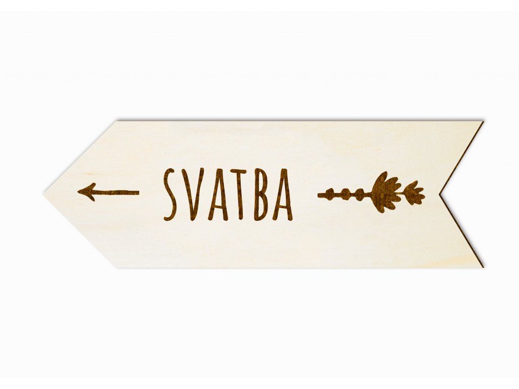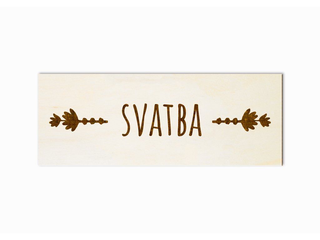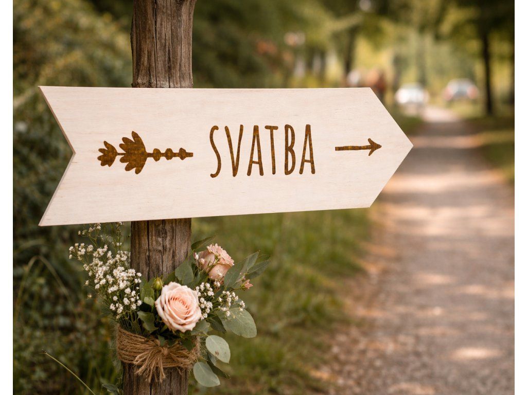 Text „SVATBA" je pouze inspirace - rádi vygravírujeme cokoliv na přání. Třeba jména novomanželů, název místa, čas obřadu nebo jen prostý nápis „Tady to je". Stačí napsat do poznámky k objednávce.
