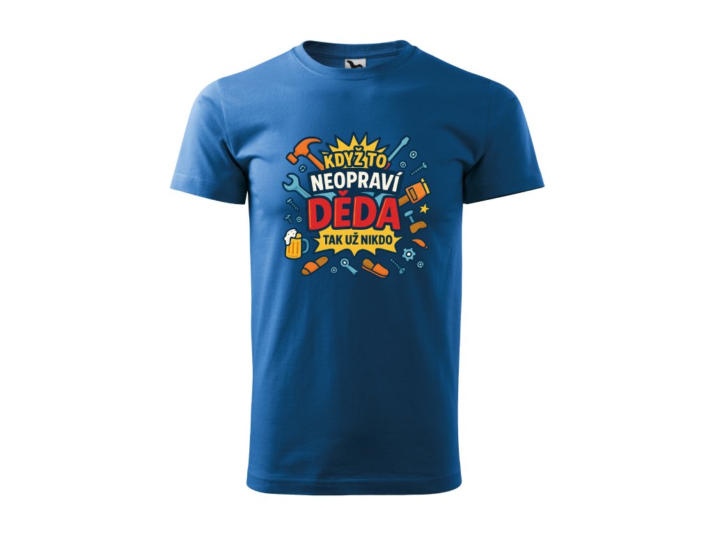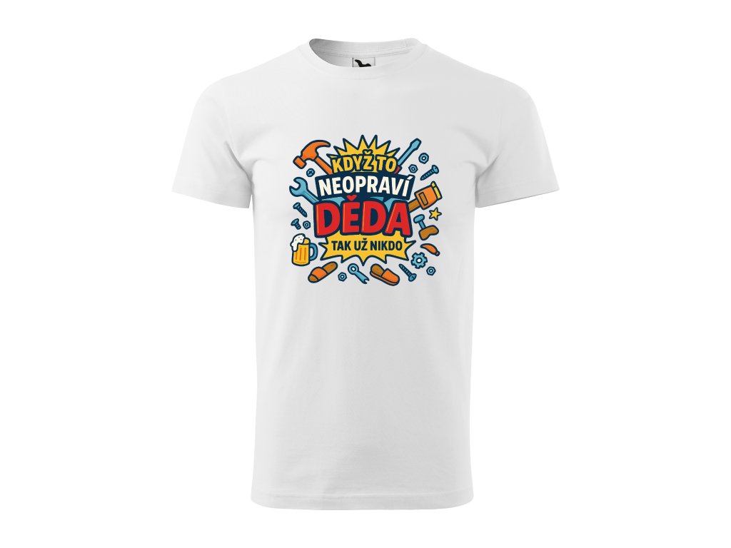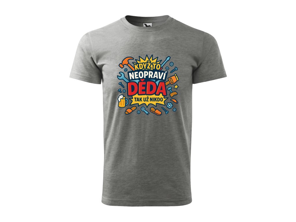 Děda opraví všechno – a když ne on, tak už opravdu nikdo! Toto pánské tričko s výrazným barevným komiksovým potiskem „Když to neopraví děda, tak už nikdo“ je ideální pro každého šikovného dědečka, který má doma vždy po ruce kladivo, šroubovák i moudrou radu.