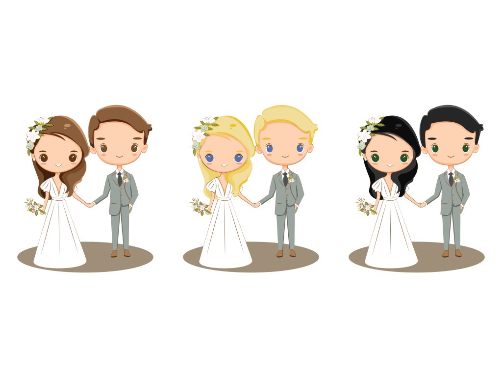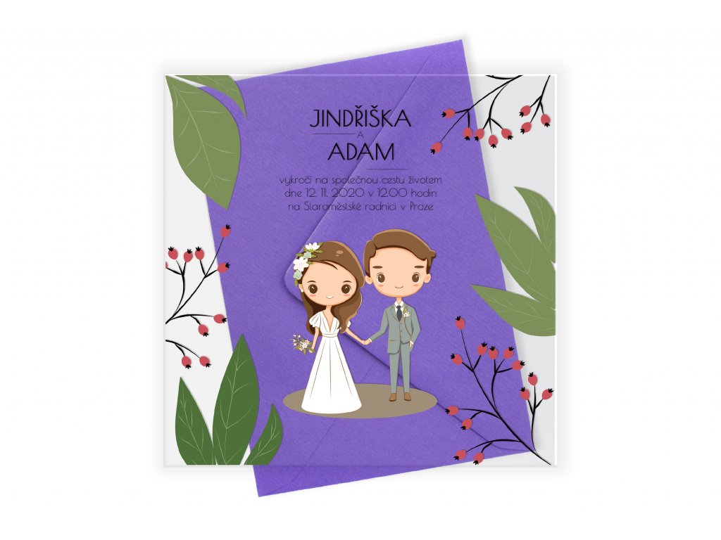 Obálka není součástí dodávky. Barvu vlasů (hnědé, blonďaté, černé) i očí (hnědé, modré, zelené) ženicha i nevěsty můžeme měnit. Napište nám požadavek do poznámky.